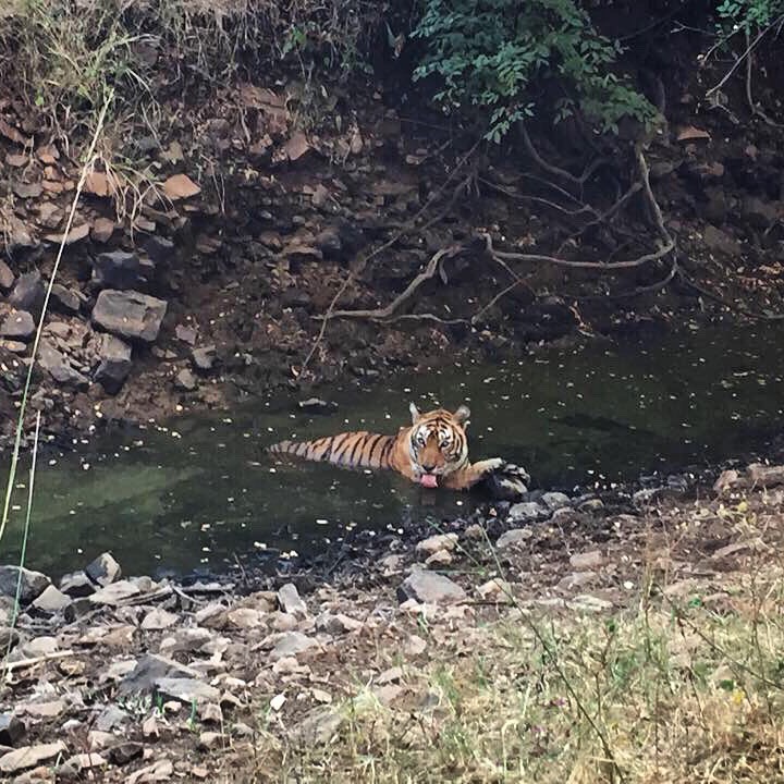 a medve latvanyatol egy ideig feldobottan furikaztunk fel-ala, de lassan kozeledett a zarora es ugyan kulonbozo nyomokat talaltunk es jelzohangokat is hallottunk mas allatoktol, tigrisnek nyoma se volt. mi mar epp kezdtuk vigasztalni magunkat, hogy legalabb megprobaltuk es vegulis medvet sokkal nehezebb latni, amikor a vezetonk utolso otletkent benavigalt minket egy kisebb tavacska melle.