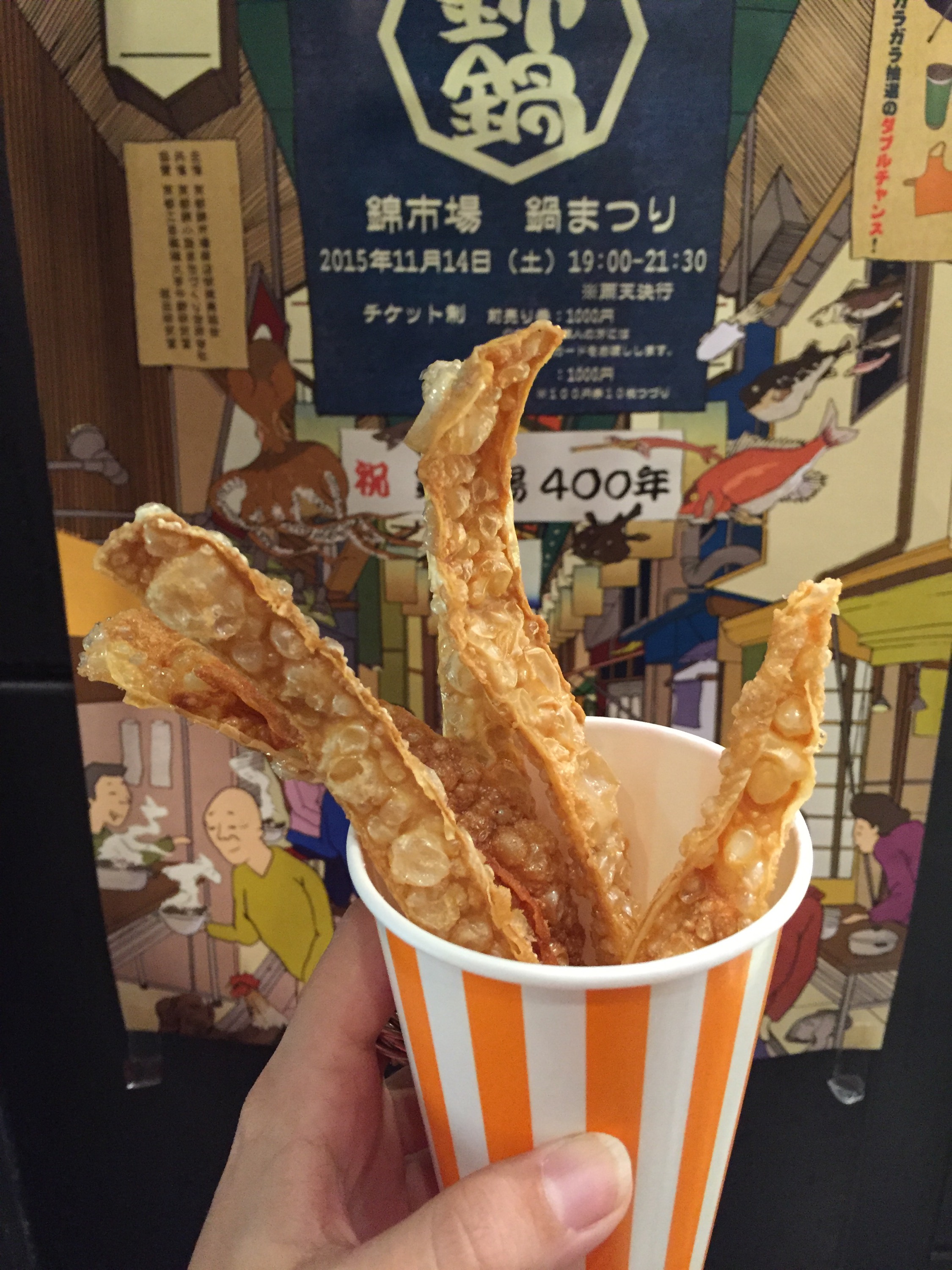 kiotoban epp szakad az eso, ezert nem volt jobb programotletem, mint a fedett nishiki market, amit kioto spajzanak is hivnak. azon tul, hogy tele van izgalmas portekakat arulo standokkal (lasd meg: furjtojassal toltott mini polip nyarson), nagyon jokat is lehet itt enni.