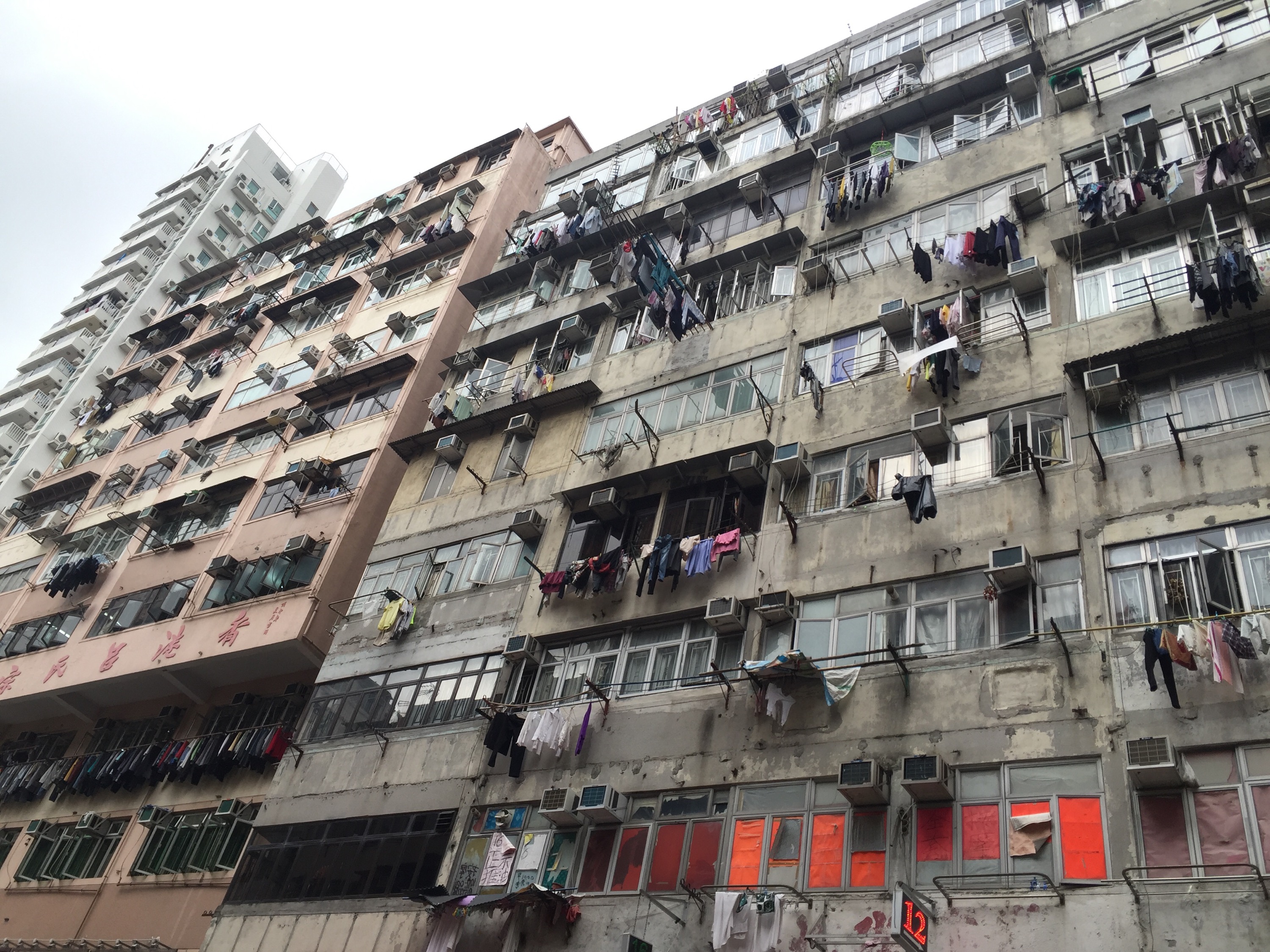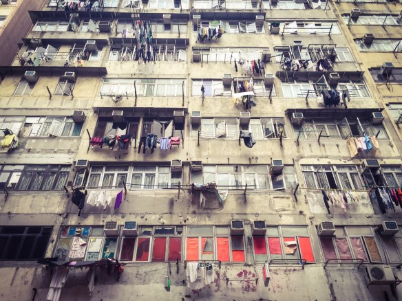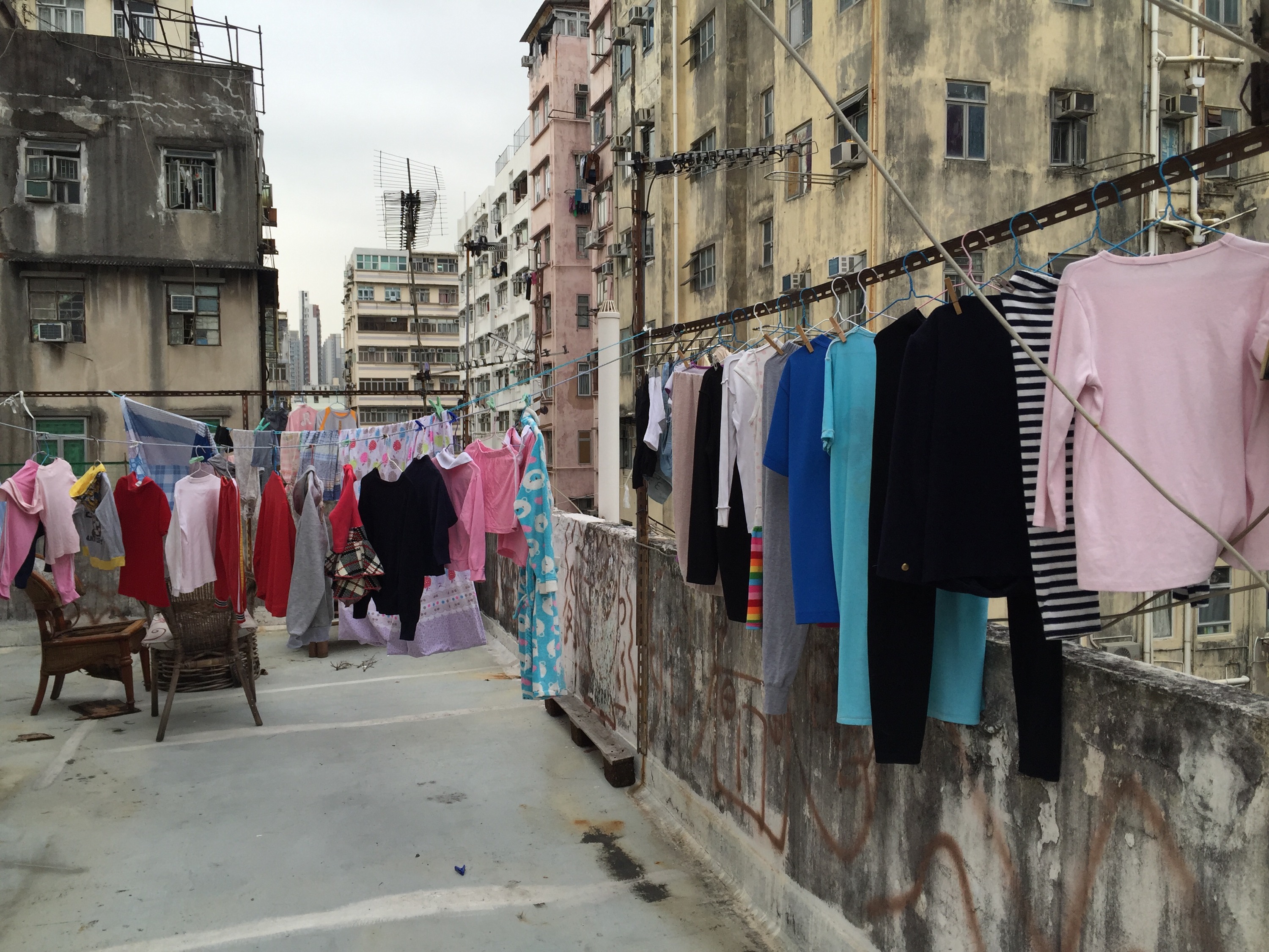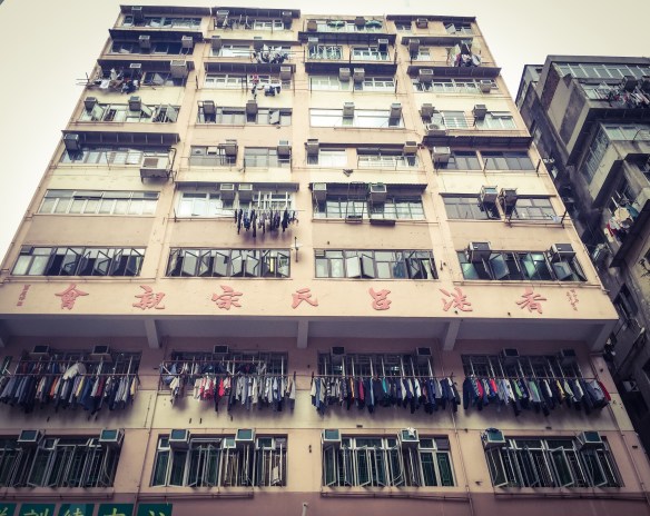 innentől a történetem nem annyira izgalmas, mert jobb híján elcsoszogtam a szemközti Two Dollar Shopba és egy rahedli színes csipesszel, illetve felakasztható csipeszelő bugyiszárító aparátummal tértem vissza. menet közben azonban teljesen mesebeli látványként terült elém a környék, minden ablakból száradó ruhák lógtak, néhol a klasszikus vállfás megoldással, néhol Európában is ismert csipeszelős módszerrel és egyes helyeken még old school módra bambusz rúdakra felhúzva. mindezt a tizenkilencedik emeleten, a légkondid mellett. a látvány egyrészt nagyon vicces volt, másrészt örömmel töltött el, mert ez volt az első dolog, amit valaha láttam HK-ból, amint kinéztem egy taxi ablakán, légkondik és embertelen magasságban száradó gatyák. akkor mondtam azt, hogy nekem ez kell. és tényleg.