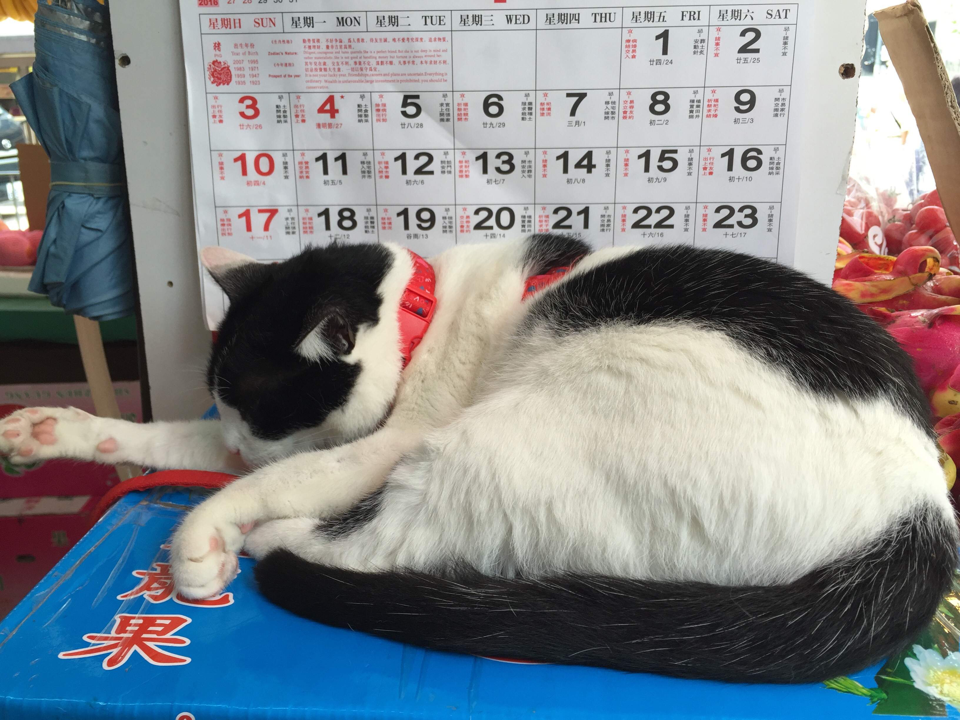 ezt kovetoen belevetettem magam a piac nyuzsgesebe, ahol gyanus eredetu gozgombocot vettem nejlonzacskoban (mert stomach flu legyen a talpan, ami elriaszt engem a street foodtol), majd szezamszoszos rizstesztat hungarocell dobozkaban, es ezekkel felfegyverkezve meglatogattam kedvenc terapias macskamat (HK tele van terapias macskakkal, akik kulonfele boltok tulajdonat kepezik, de a nap bizonyos oraiban josagosan elterulnek az erre rendszeresitett dobozon / gyumolcsos standon es josagosan hagyjak, hogy az utca stresszes (vagy akut macskahianyban szenvedo) nepe megdogonyozze oket).