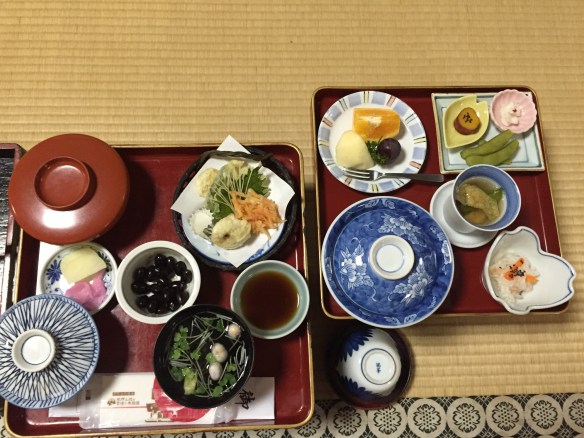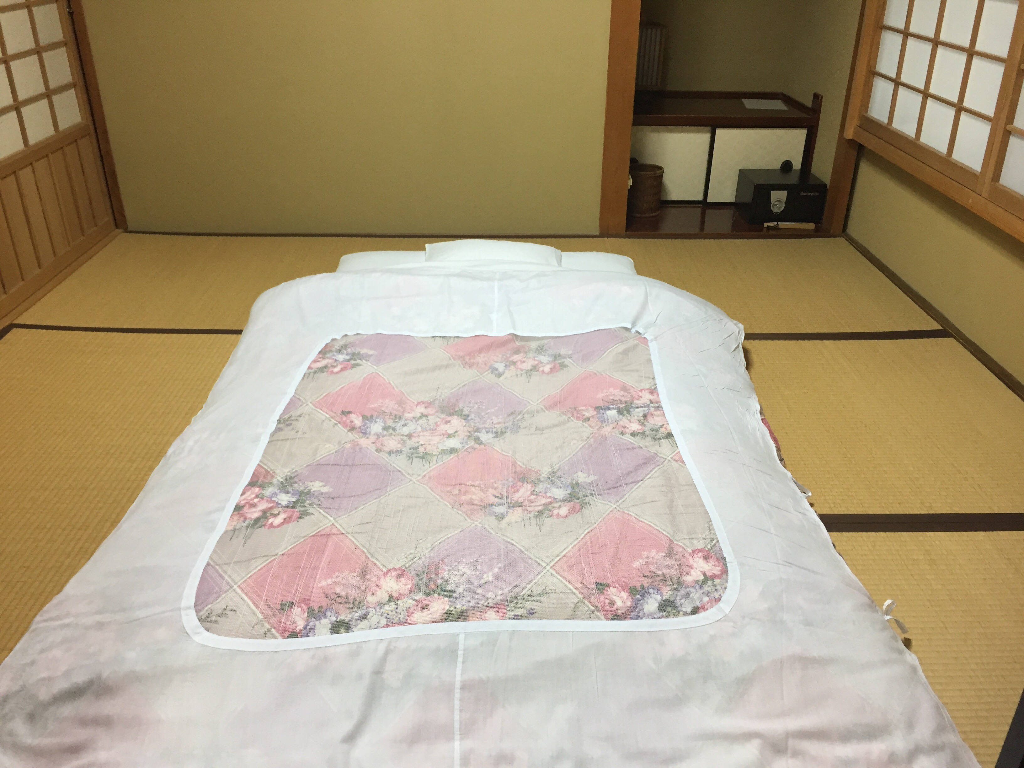 rovid adminisztracio utan kaptam magam melle egy rendkivul szorakoztato figurat, aki viharos sebesseggel vegigvezetett az egesz komplexumom, megmutatta a szobamat, elmagyarazta, hogy hogy mukodik a villanykapcsolo, vigyorogva ramutatott az ajandek sutikere es nyomatekosan elmutogatta ketszer is, hogy eszembe ne jusson jukattaban megjelenni a masnap hajnali szertartason. a szoba tradicionalis tatamis – futonos gyonyor volt, talan egy kep jobban leirja az elmenyt. (es peldaul emlekeim szerint nem lehetett kulcsra zarni, de volt benne hosugarzo, aminek ertheto modon nagyon megorultem. meg ugye mit zarjak kulcsfa egy papirajton).