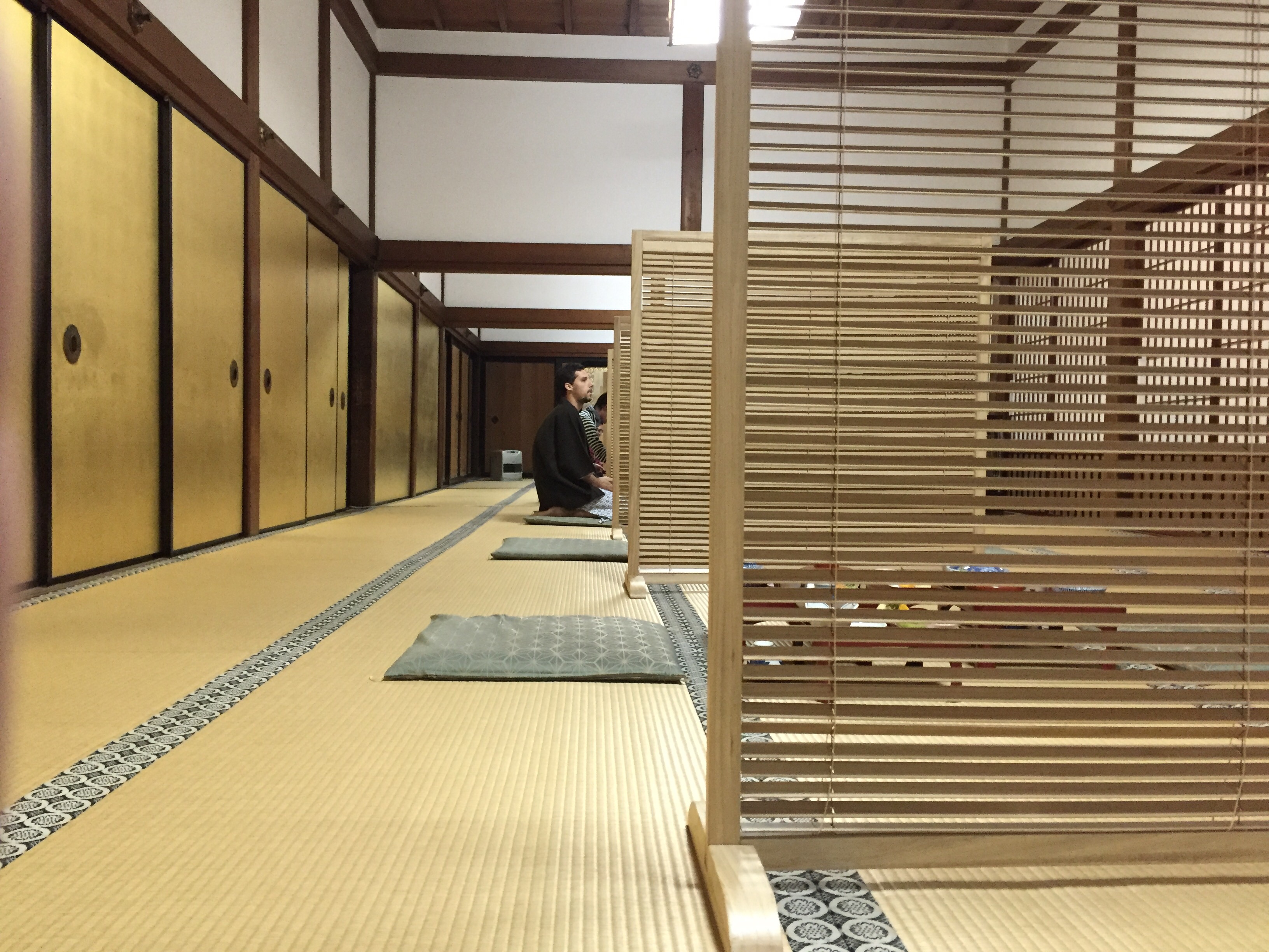 erkezesemkor szornyulkodve konstataltam, hogy mar megint nem hoztam termozoknit, marpedig a cipot szigoruan a bejaraton kivul kell hagyni es bar adnak papucsot, nagyjabol 45-os meretben lehet benne klaffogni, szoval maradt az illedelmes csoszogas, ha az ember nem akar hulyegajdzsin modjara hasra esni. az egesz epulet fabol keszult es tradicionalis papirfalak es toloajtok hataroljak a helyisegeket, gondolhatjatok, hogy marha meleg van.