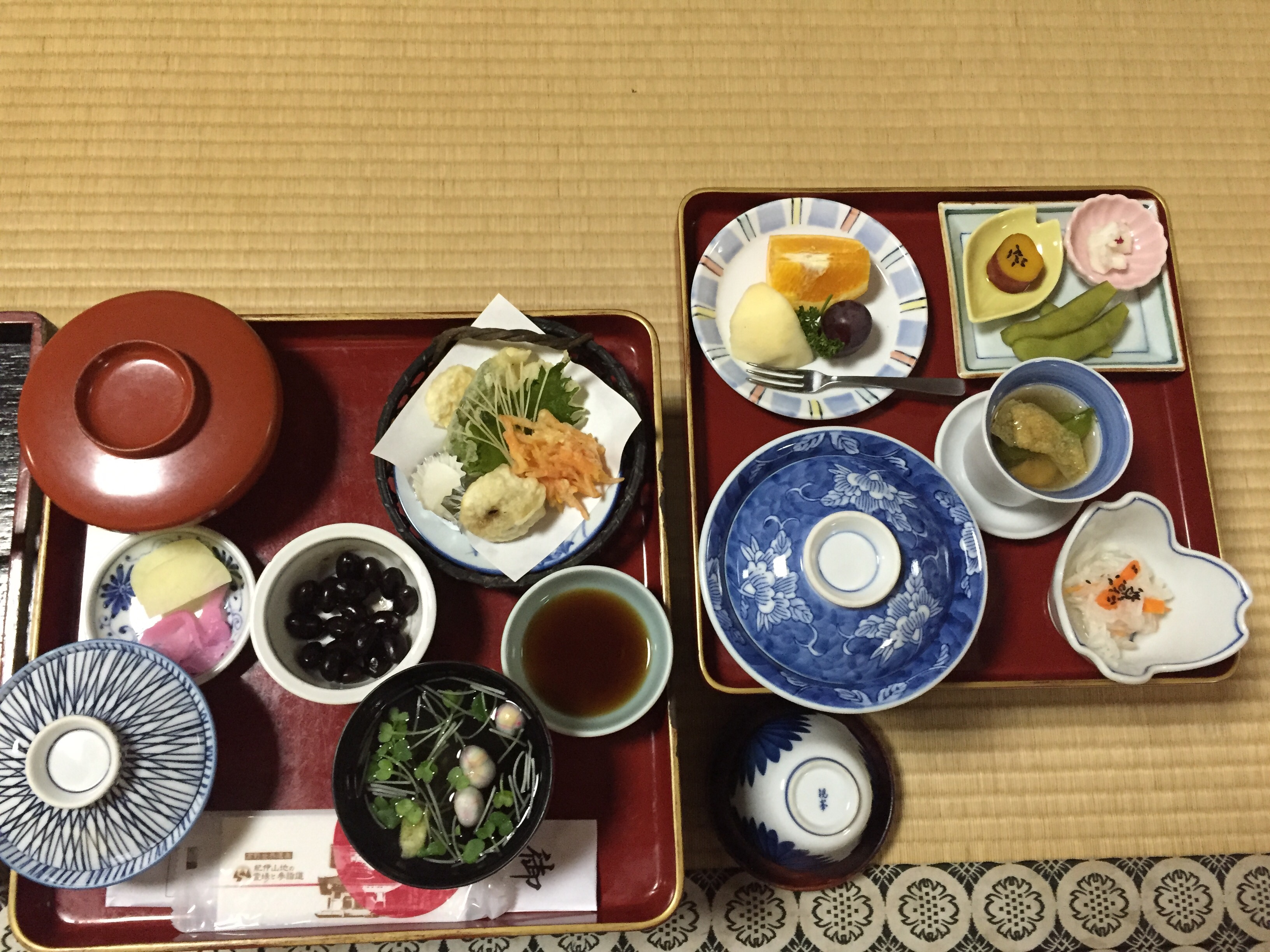 a szallashoz egyebkent egy vacsora es egy reggeli is jart, lenyugozo, teljes mertekben vegetarianus menusorral, ami annyira jol nezett ki, hogy szinte sajnaltam megenni. az eteleket egy nagy teremben szolgaltak fel, de szobankent szeparaltak minket izleses paravanokkal, amitol az egesznek hihetetlen meghitt es nyugodt hangulata volt (leszamitva, hogy tovabbra se igazan birtam hogyan ulni), egyedul egy amerikai kozepkoru hazaspart akartam volna fejbevagni, amiert mindent kurva hangosan kommentaltak (mondjuk en meg a nagy zenben mobillal fotoztam mindent diszkreten, de legalabb csondben voltam). lassatok alant a felszolgalt vacsorat, az etkezot es a hihetetlen esztetikus teat, amit adtak hozza. az etelek kimondottan finomak voltak es jol is laktam. bevallom, extran buszke voltam magamra, hogy az osszes osszetevot be birtam azonositani. a reggelit is hasonloan kepzeljetek el.