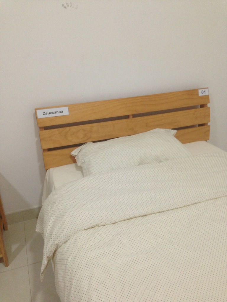 tudtam mar messzirol, hogy melyik lesz a ceges szobam, mert a gyari szobaszam alatt ott volt egy cetlin kiragasztva a jellegzetes laminalt ceges szobaszam, kis logoval. az agyamat is szepen feldekoraltak. a kettes agyon egyebkent nem fekszik senki, ami szuper, es meg szekrenyem is van, ami csodas…lesz majd, ha kedden ide er a borondom, mert az megis csak dohaban maradt valahogy.